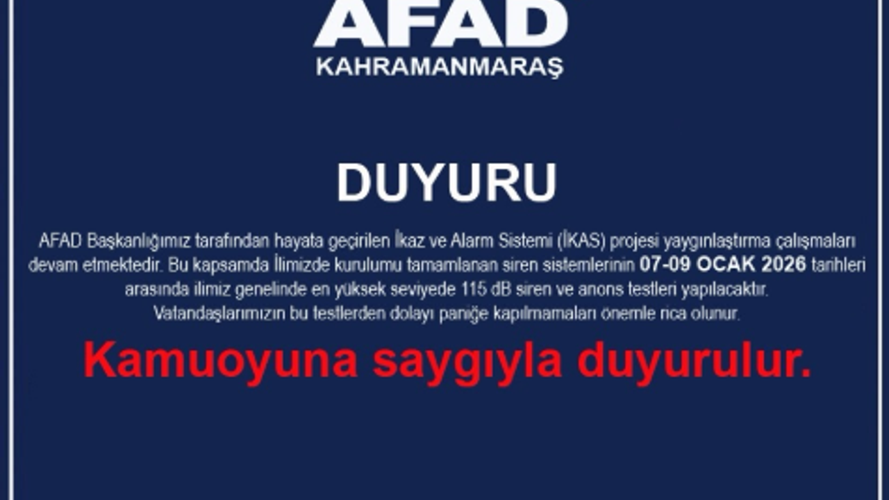 AFAD Kahramanmaraş İl Müdürlüğü, il genelinde kurulumu tamamlanan deprem erken uyarı ve alarm sistemlerinin test edileceğini duyurdu. Yapılan açıklamaya göre, AFAD Başkanlığı tarafından hayata geçirilen kaz ve alarm sistemi kapsamında, 7–9 Ocak 2026 tarihleri arasında ilimiz genelinde en yüksek seviyede 115 dB gücünde siren ve anons testleri gerçekleştirilecek.