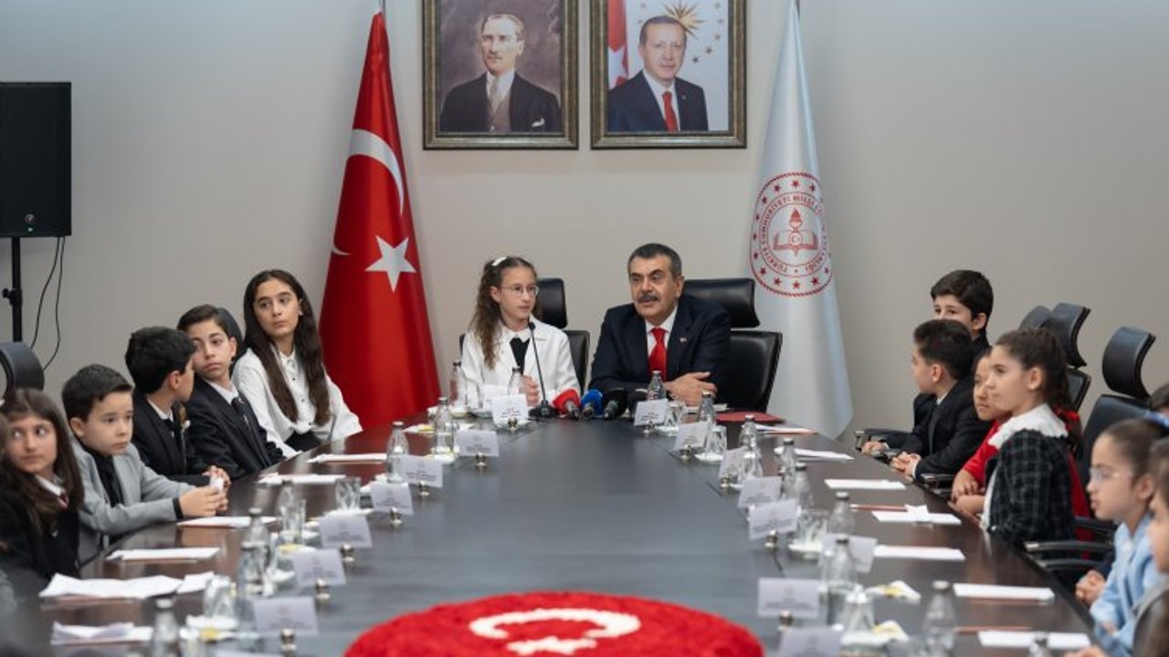 Türkiye Büyük Millet Meclisi’nin açılışının 106. yıl dönümüne denk gelen özel günde, farklı okullardan gelen öğrenciler Bakanlıkta ağırlandı. Anıtkabir programının ardından Bakanlığa geçen Tekin’i, ellerinde Türk bayrakları taşıyan çocuklar ve öğrenci bandosu karşıladı.