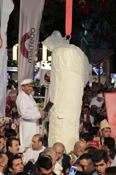 Kahramanmaraş'ta 1. Uluslararası Kahramanmaraş Dondurma ve Kültür Festivali kapsamında, dünyanın en uzun çengel dondurması için rekor denemesi yapıldı.