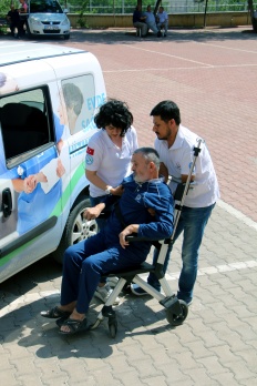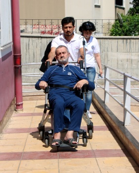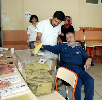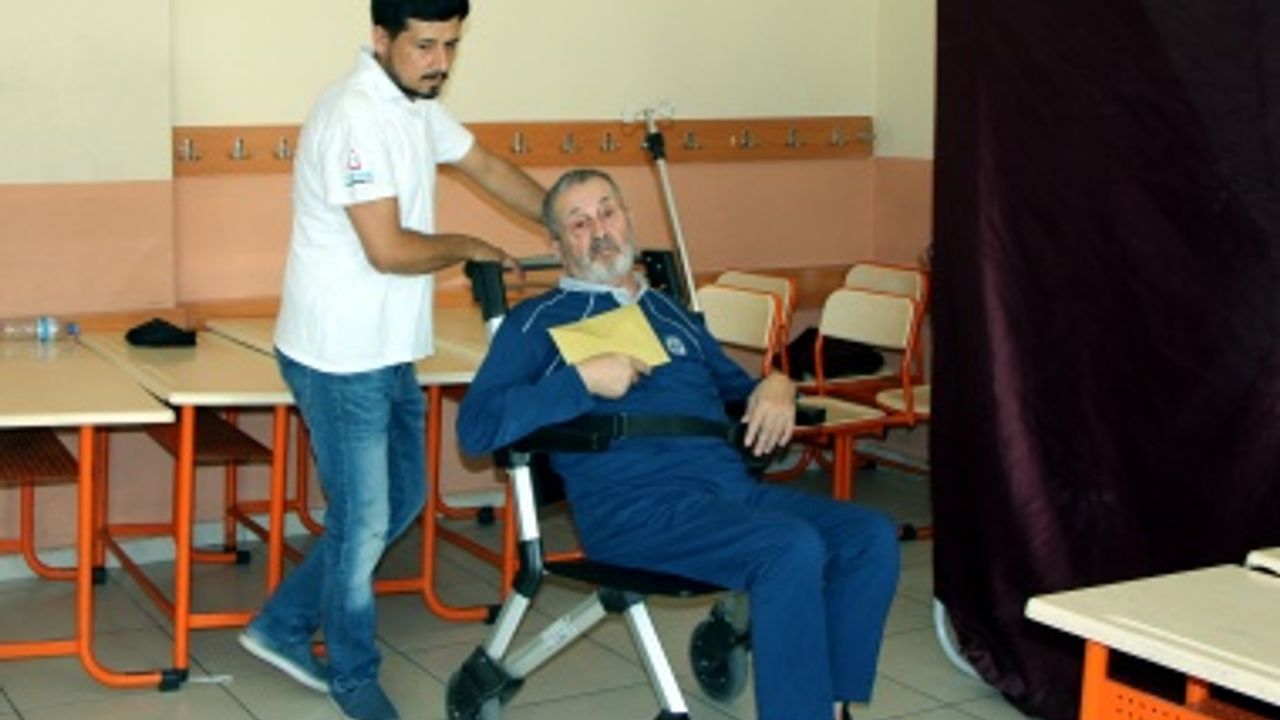 Kahramanmaraş'ta felçli Mehmet Küçükdevlet, Cumhurbaşkanlığı ve 27. Dönem Milletvekilliği seçimi için Evde Sağlık Hizmetleri ekiplerince götürüldüğü okulda oy kullandı.