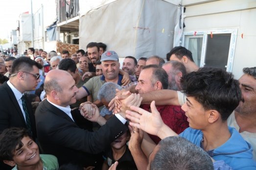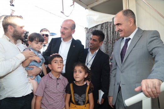 İçişleri Bakanı Süleyman Soylu (ortada), Kahramanmaraş Geçici Barınma Merkezi'ni ziyaret etti.
