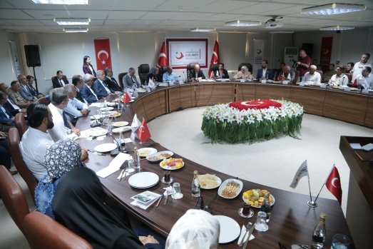 İçişleri Bakanı Süleyman Soylu (ortada), Kahramanmaraş Geçici Barınma Merkezi'nde Suriyeli kanaat önderleriyle bir araya geldi.