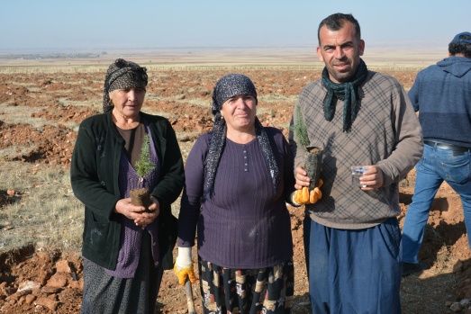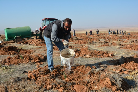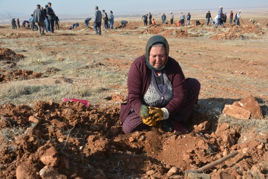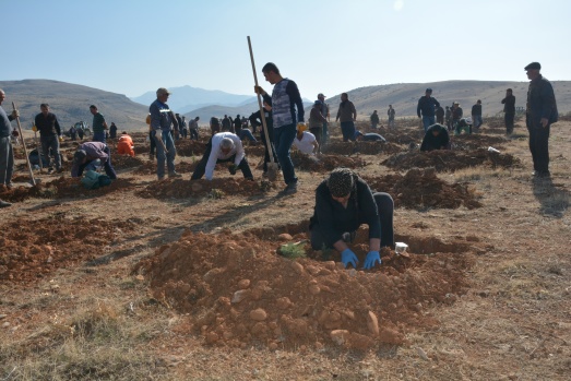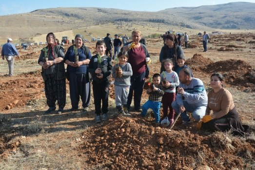 Sabahın ilk ışıklarıyla bölgeye giden mahalleli Kahramanmaraş Orman Bölge Müdürlüğünden temin edilen fidanları Mengelis mevkisinde toprakla buluşturuyor.