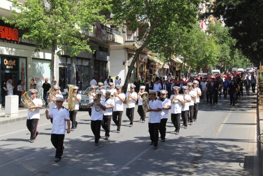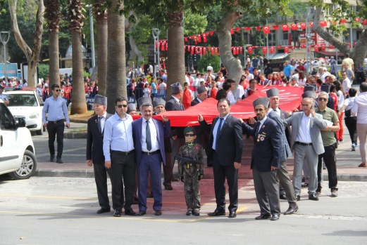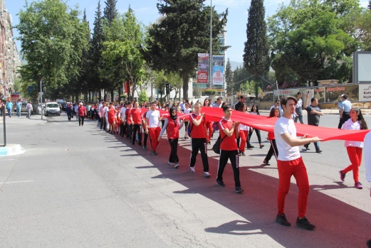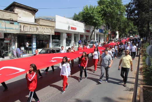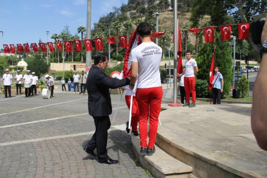 . Buradan 150 metrelik Şanlı Türk Bayrağı açılarak Şehir merkezinden Büyükşehir Belediye Bandosunun çaldığı marşlar eşliğinde şehir merkezinde kortej yürüyüşü yapıldı. Yürüyüş 19 Mayıs Atatürk’ü Anma Gençlik ve Spor Bayramı Kutlama gösterilerin yapılacağı Osman Sayın Spor Sayın Salonu da tamamlandı
