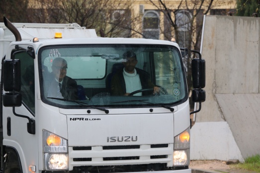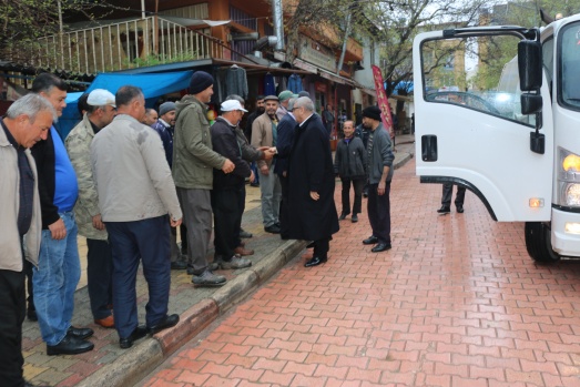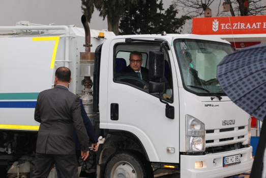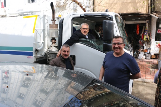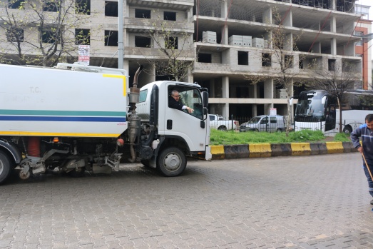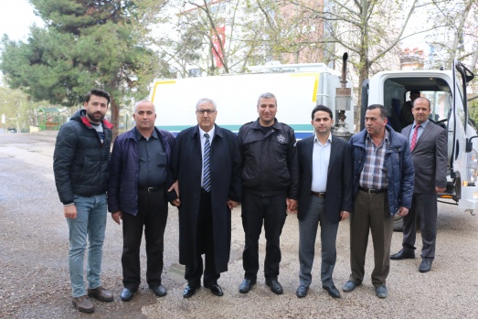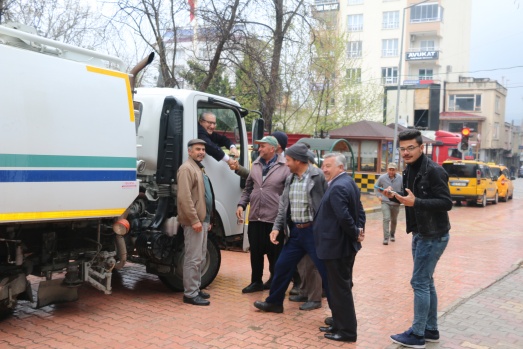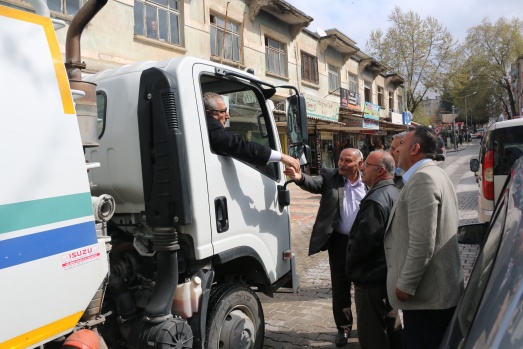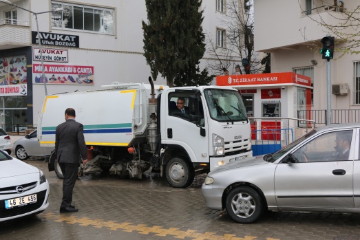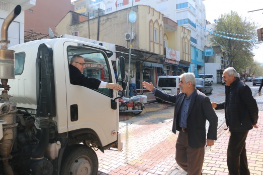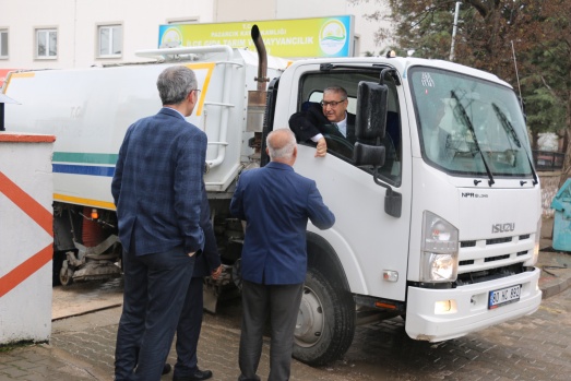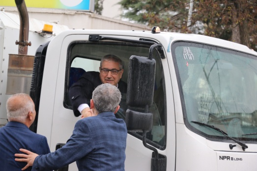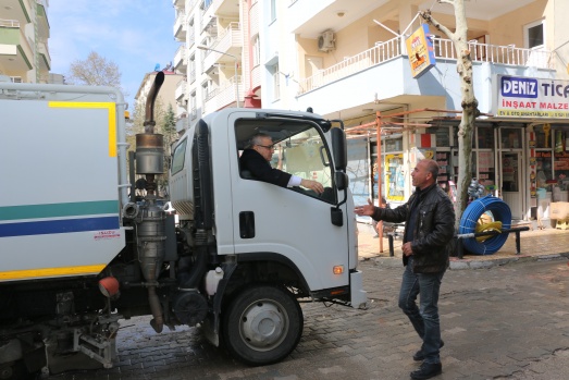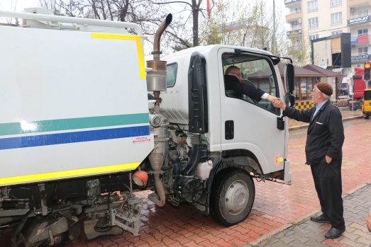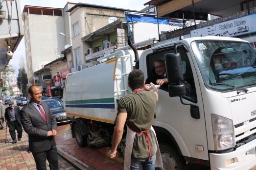 Bu günde sabahın erken saatlerinde Belediyenin temizlik aracına binerek araç şoförüyle birlikte ilçenin caddelerini temizleme işine iştirak ederken araç içinden de vatandaşları selamladı.
