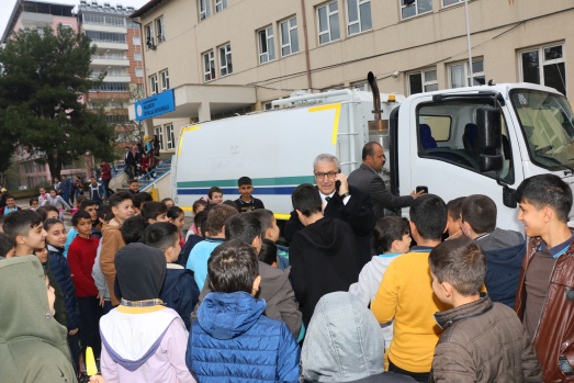 Pazarcık Belediye Başkanı İbrahim Yılmazcan Belediye temizlik aracına binerek cadde ve sokak temizliğinde bulunup aynı arabayla öğrencilerle bir araya geldi.