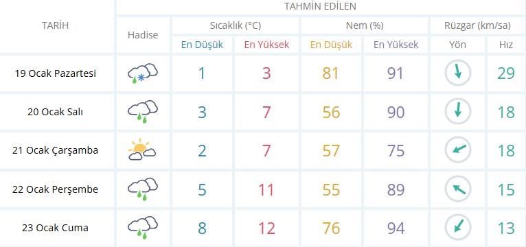 Yağışlı hava etkisini sürdürecek. Sıcaklıklar 3 ile 7 derece arasında seyredecek. Yüksek nem ve rüzgâr nedeniyle hissedilen sıcaklık -4,2 derece olacak.