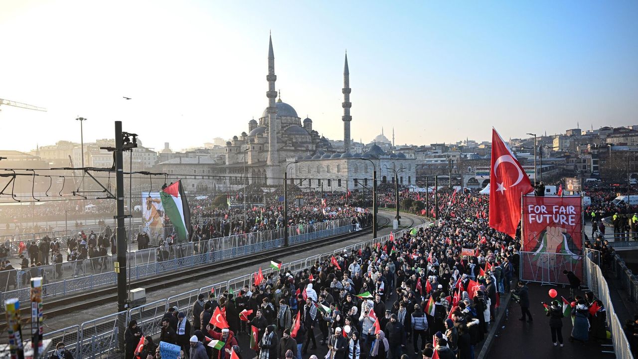 Katılımcılar, sabah namazı sonrası protokoldekilerle eyleme katılmak için "Sinmiyoruz, susmuyoruz Filistin'i unutmuyoruz" sloganıyla Galata Köprüsü'ne yürüdü.