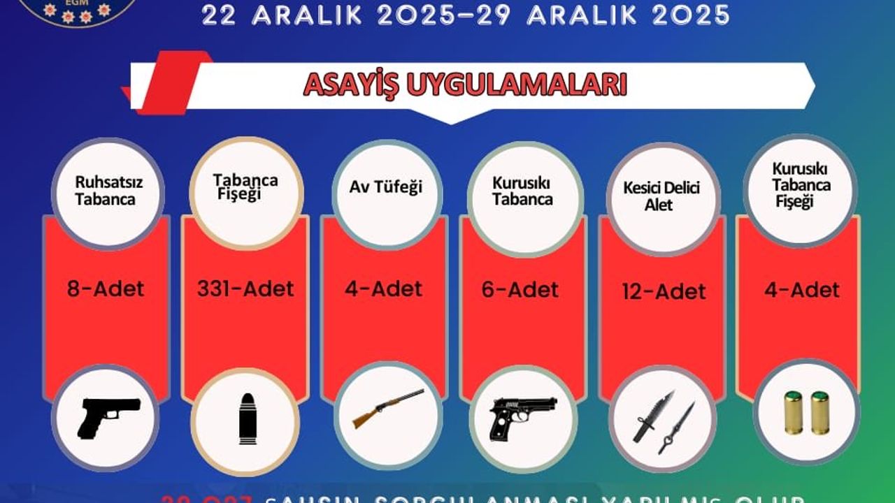 Emniyet ekiplerince yapılan asayiş uygulamalarında toplam 39 bin 27 kişinin sorgulaması gerçekleştirildi. Çeşitli suçlardan aranan 82 şahıs yakalanırken, adli makamlara sevk edilen şüphelilerden 17’si tutuklandı. Denetimlerde 8 ruhsatsız tabanca, 4 av tüfeği, 6 kurusıkı tabanca, 12 kesici ve delici alet ile 335 adet fişek ele geçirildi.
