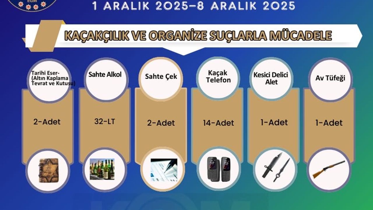 Denetimlerde 32 litre sahte alkol, 14 kaçak telefon ve altın kaplama 2 adet Tevrat ele geçirildi.