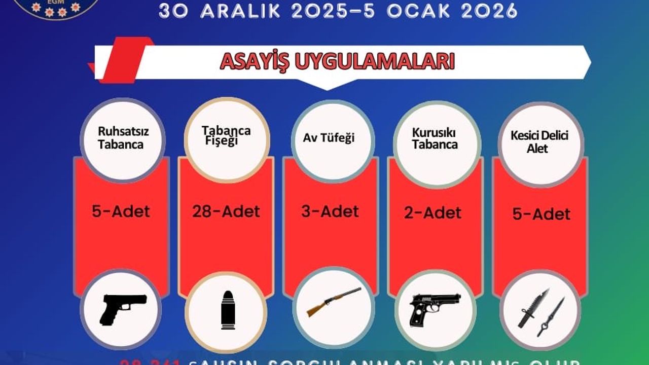 Asayiş uygulamaları kapsamında hafta boyunca 28 bin 361 şahsın sorgulaması yapıldı. Aranan 63 kişi yakalanırken, adli makamlara sevk edilen 12 şahıs tutuklanarak cezaevine gönderildi. Denetimlerde 5 ruhsatsız tabanca, 28 tabanca fişeği, 3 av tüfeği ile 5 kesici-delici alet ele geçirildi.