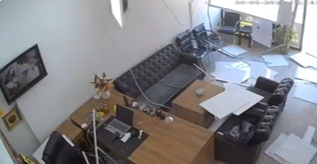 Güvenlik kamerasına yansıyan görüntülerde, iş yerinde bulunan bir kişinin arka bölüme geçmesinden kısa süre sonra tavanın çöktüğü anlar yer aldı.