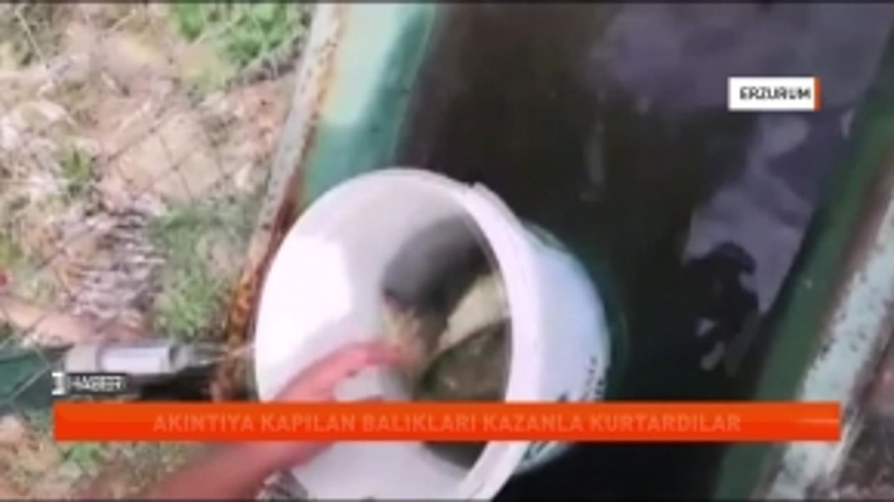 Erzurum'da gölet suyunun çekilmesi sonucu akıntıya kapılan balıklar vatandaşlarca yemek kazanları yardımıyla kurtarıldı.
