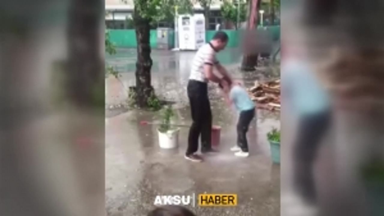Saçak altına geçip çatıdan akan yağmur suyunun altında iki oğlunu yıkayan babanın görüntüsü görenleri gülümsetti.