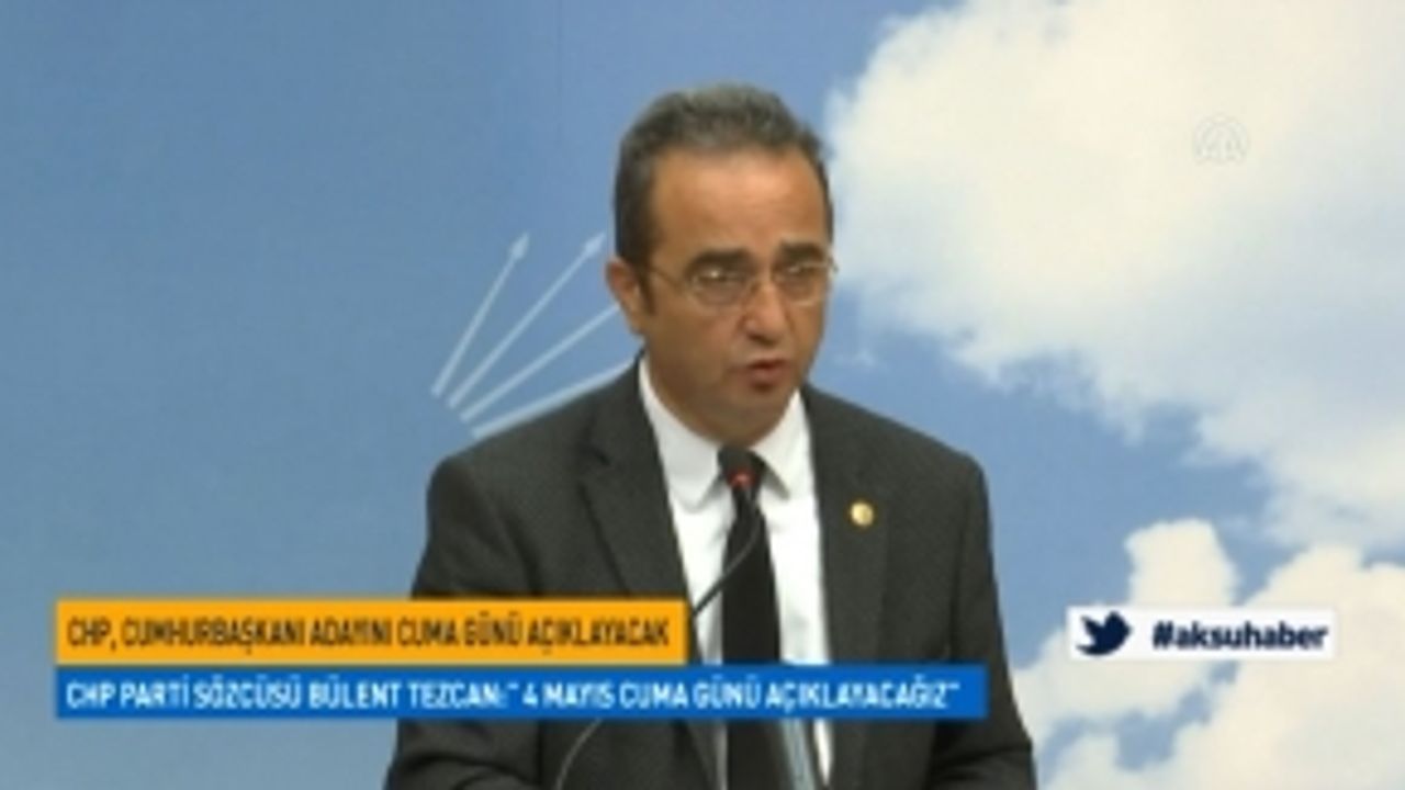 CHP Genel Başkan Yardımcısı ve Parti Sözcüsü Bülent Tezcan, CHP'nin Cumhurbaşkanı adayını 4 Mayıs Cuma günü saat 10.00'da Ahmet Taner Kışlalı Spor Salonu'nda açıklayacaklarını bildirdi.