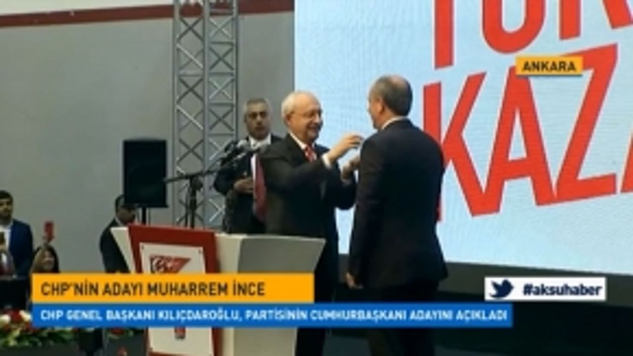 CHP Yalova Milletvekili Muharrem İnce, partisinin cumhurbaşkanı adayı olarak açıklandı. Tanıtım toplantısında konuşan İnce, "Herkesin cumhurbaşkanı olacağım" diyerek parti rozetini Kılıçdaroğlu'na teslim etti. Kılıçdaroğlu da İnce'ye Türk bayrağı rozeti taktı.