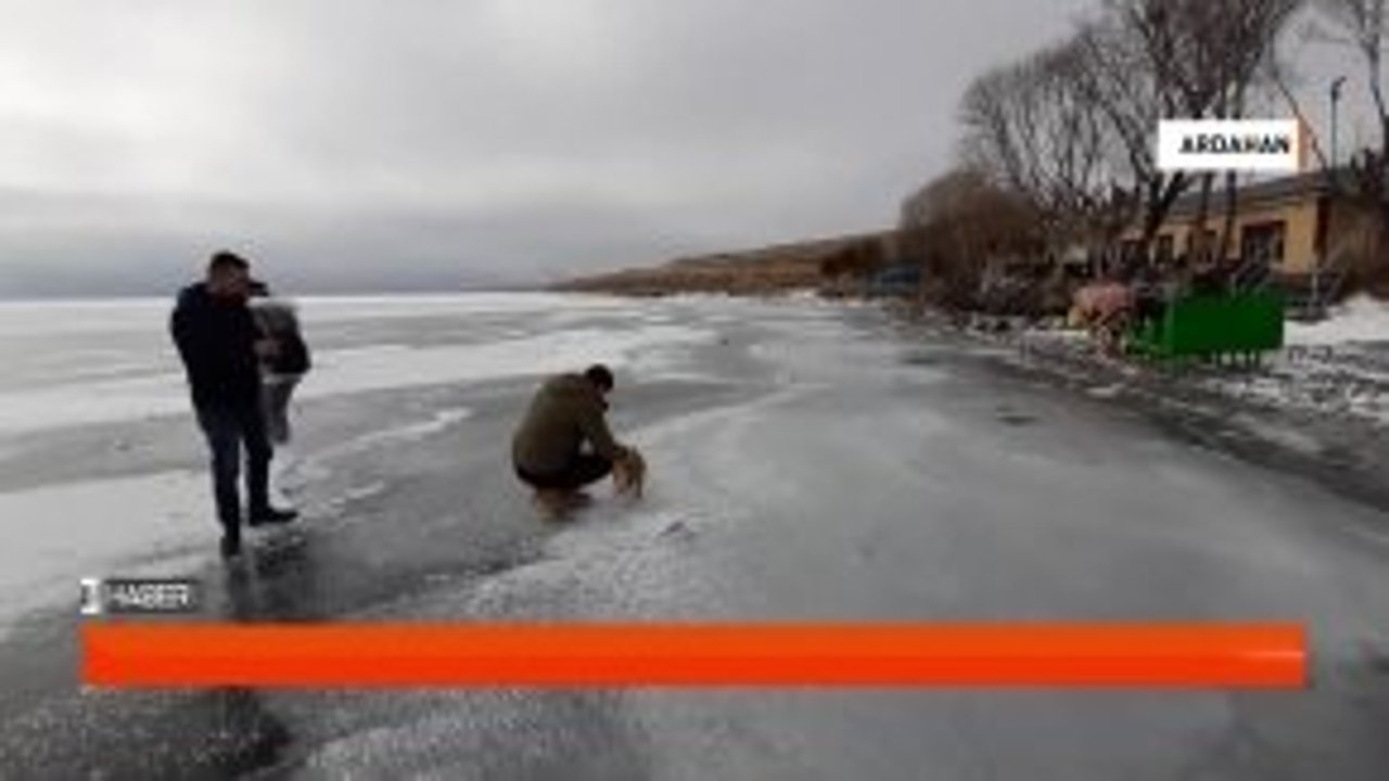 Kış mevsiminde havaların soğumasıyla yüzeyi tamamen donan Çıldır Gölü sahilindeki balık lokantasının müdavimi "Mırmır", yüzeyi buz tutan göl üstünde gezinenlerin ilgi odağı oluyor.