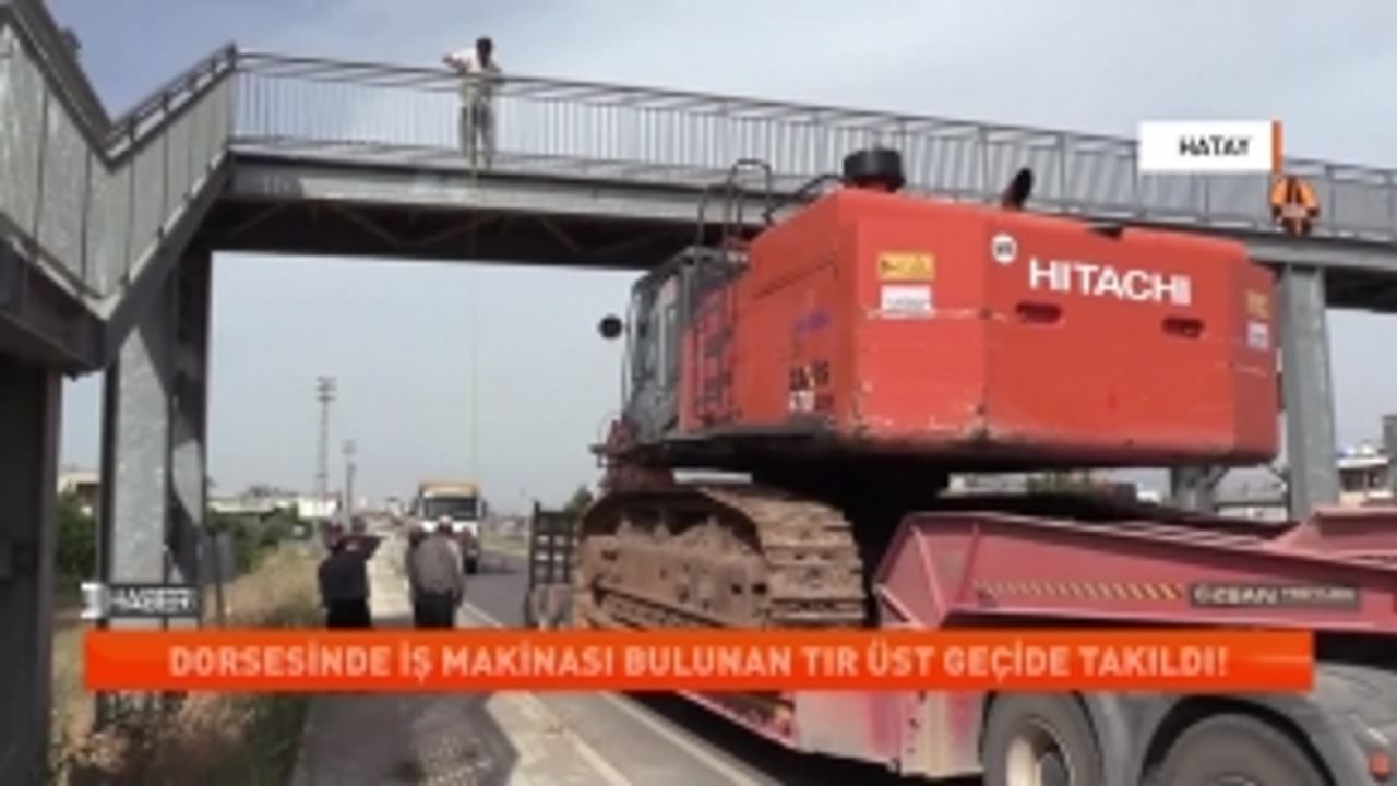 Hatay'da dorsesinde iş makinası bulunan tır üst geçide takıldı