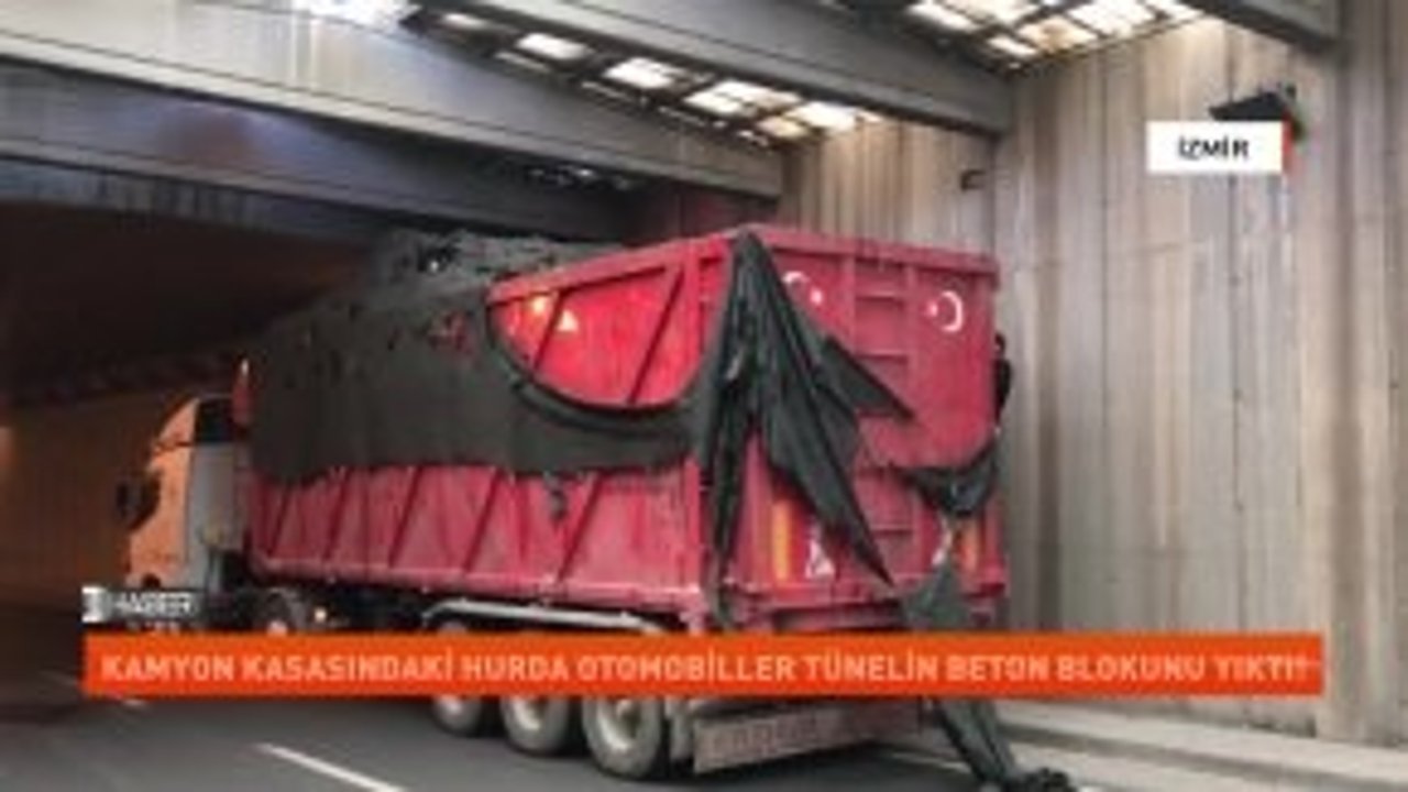 İzmir'in Bornova ilçesinde bir kamyonun kasasında yüklü bulunan otomobil hurdaları, Osman Kibar Tüneli girişindeki beton bloklara çarptı.