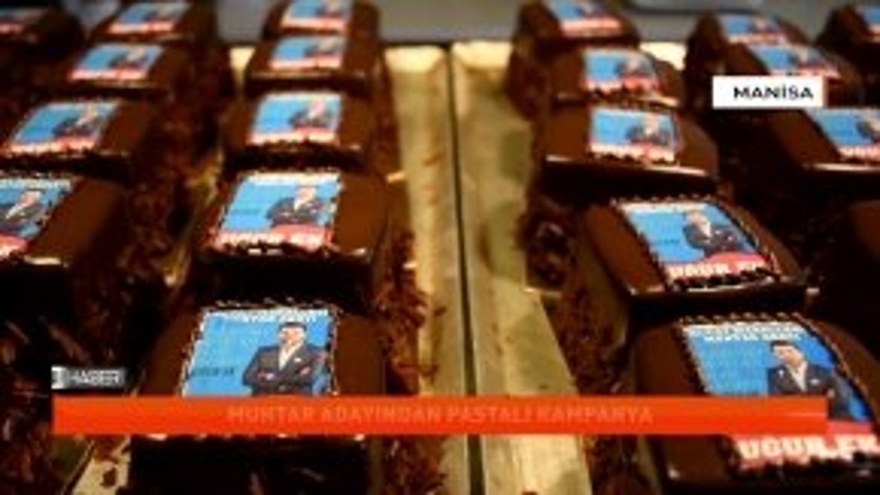 Turgutlu ilçesinde pastane sahibi muhtar adayı, seçim kampanyasına üzerinde ismi ve fotoğrafının bulunduğu pastaları dağıtarak başladı.