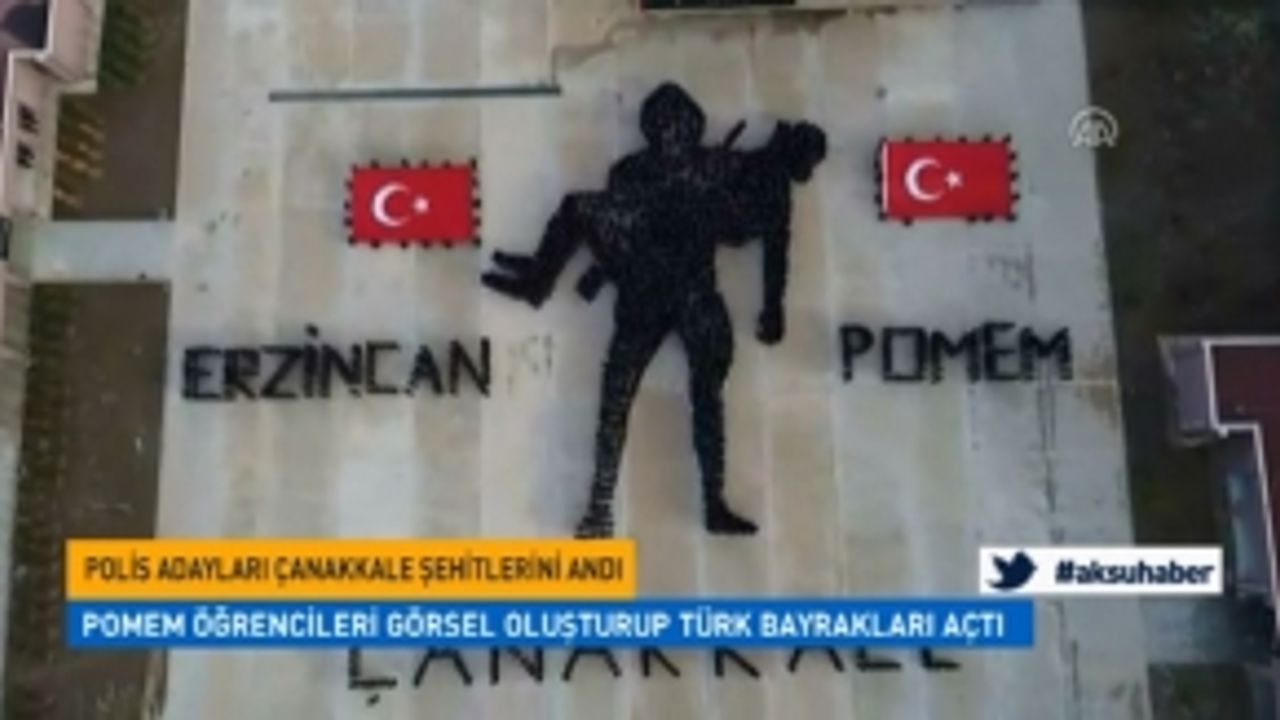Erzincan Polis Meslek Eğitim Merkezinde (POMEM) eğitim gören bin 650 öğrenci, Çanakkale şehitlerini anmak için bir araya gelip Mehmetçik'e Saygı Anıtı'nı konu alan görsel oluşturup Türk bayrakları açtı.