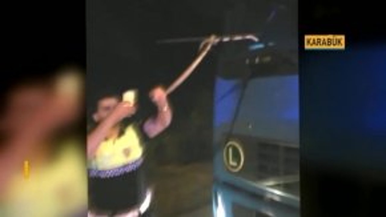 Karabük'te bir tırın sileceğine dolanan yılanı polis ekipleri aldı, yaşananlar cep telefonu kamerasına yansıdı