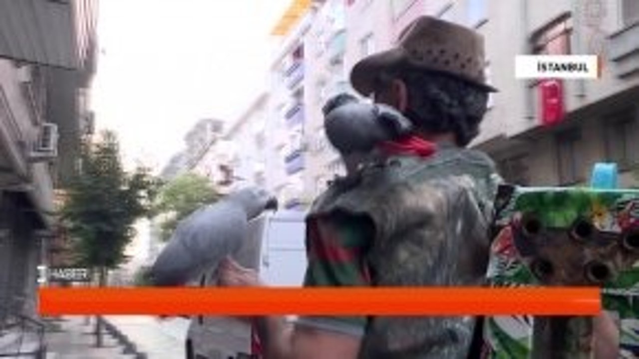 Zeytinburnu'nda iki katlı iş yerini, deniz kumu, palmiye yaprakları, ağaç dalları ve kuş sesleriyle tropik bir adaya çeviren Ürdünlü Atoum, burada sahipli papağanlara eğitim veriyor.